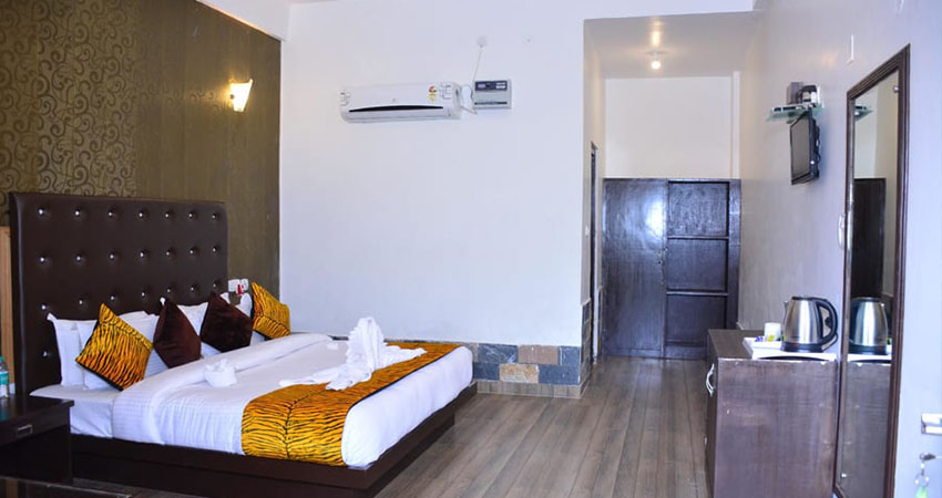 The well decorated deluxe rooms are spacious and clean with attached large balcony. Each room has twin bed with side tables, study tables, cupboard and a dressing area. The modern amenities inside the room include an intercom telephone and Wi-Fi internet facility at pocket friendly price. Interior designs of the ten of the deluxe rooms are based on the complete wildlife themes with a mud wall exterior with heavy wood crafted doors.